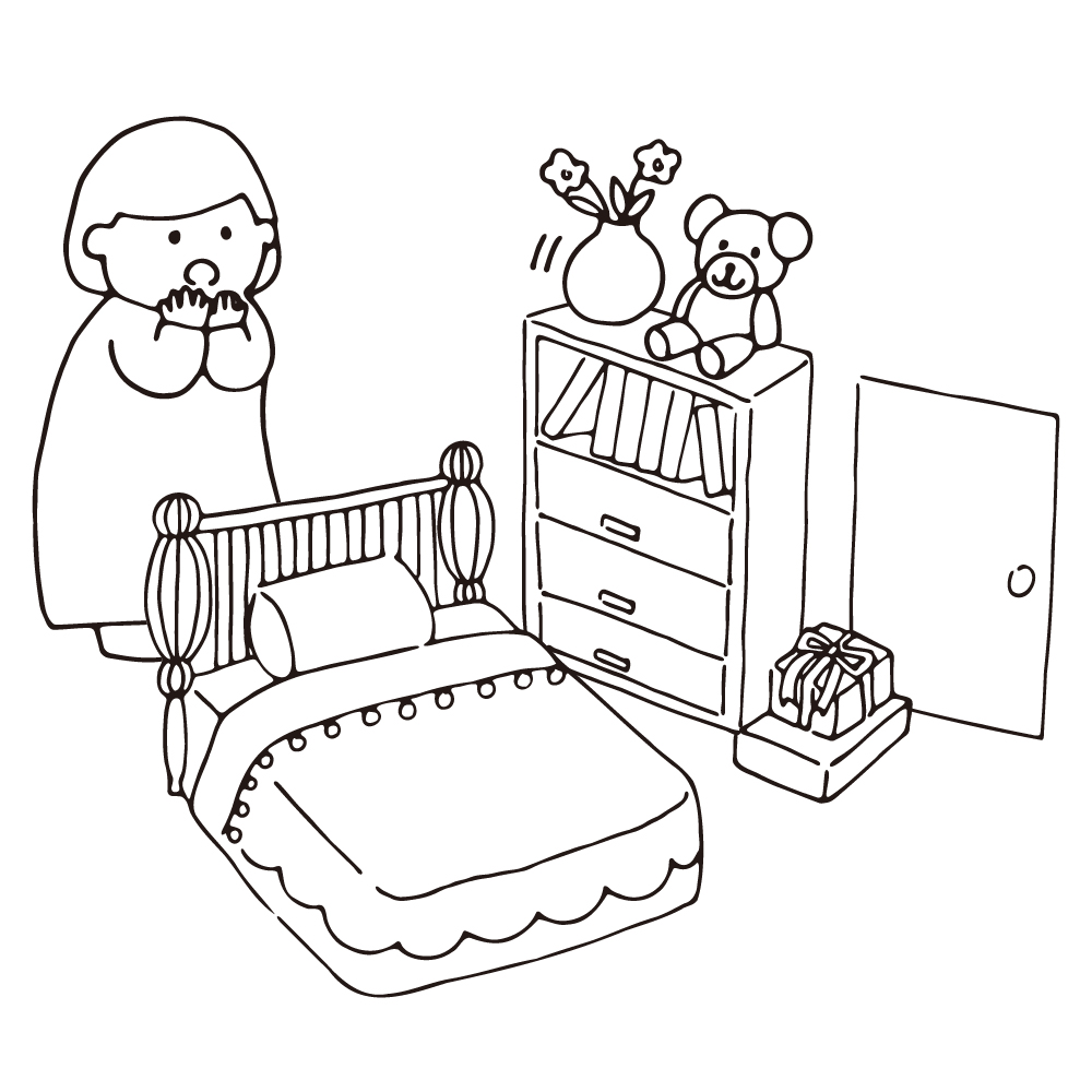 夜も地震はおこるよ。ねているところに、かたくて落ちてきそうなものはないかな?