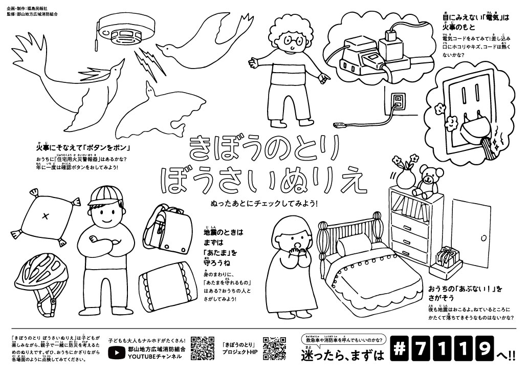 「きぼうのとりぼうさいぬりえ」は、子どもが楽しみながら、親子で一緒に防災を考えるためのぬりえです。ダウンロードして、幼稚園や保育園、小学校、防災イベントなどでご活用ください。完成後は、ぜひおうちにかざりながら各場面のように点検してみてください。
