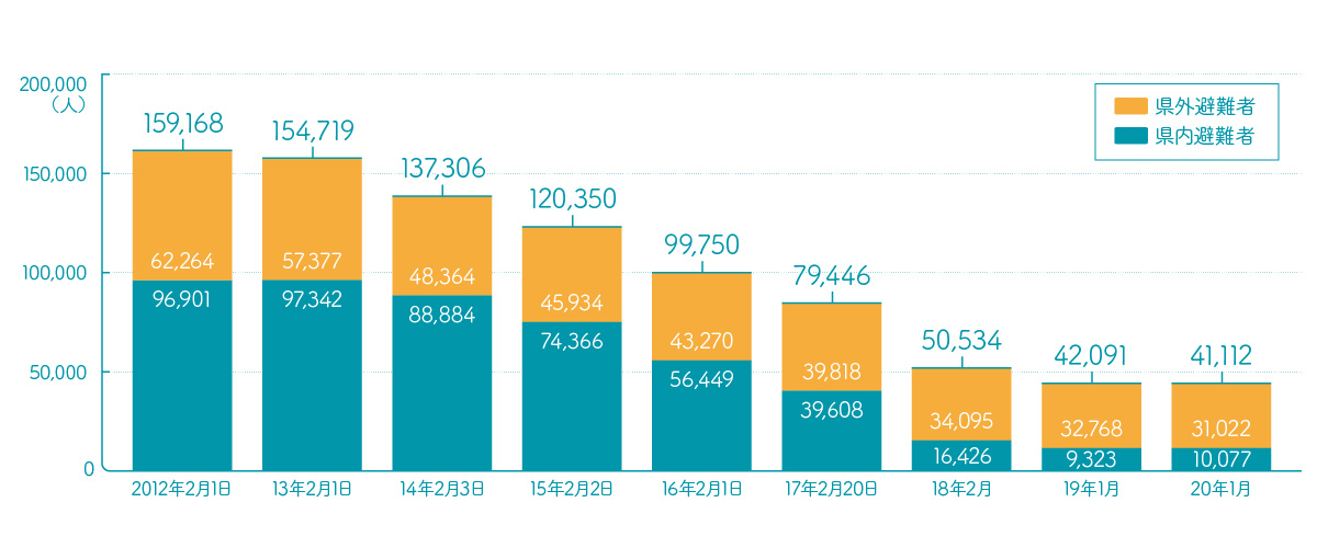 震災と原発事故の影響により多くの避難者が出たが、2020年にはピーク時の1/4に減った。