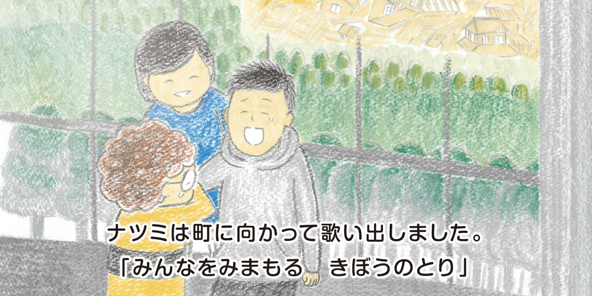 「きぼうのとり」は東日本大震災・東京電力福島第一原発事故を風化させないために企画しました。2011年3月11日に起きてしまった震災と事故。被災した方だけでなく、体験しなかった方にも自然災害の恐ろしさと人間の過信で起こした事故の悲惨さを忘れないために10歳のお子さんでもわかっていただけるよう描きました。